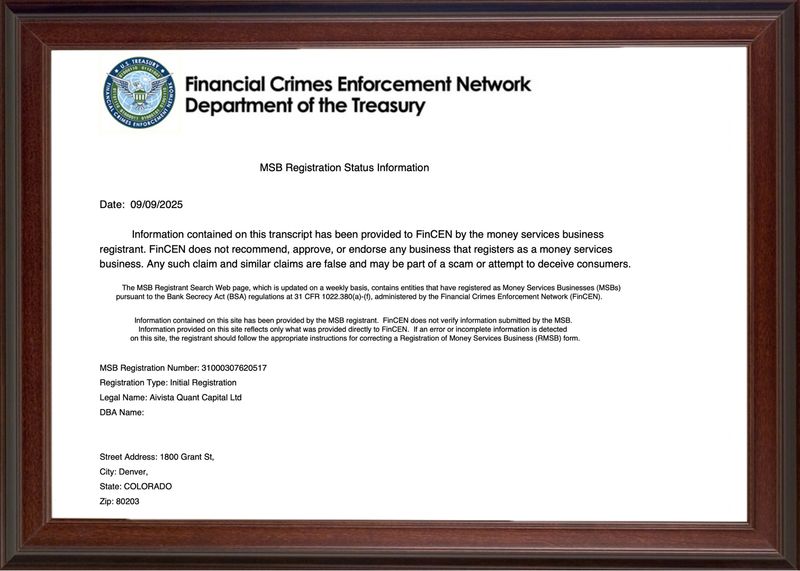 With $80 million in registered capital and full regulatory compliance as a Money Services Business (MSB), Aivista Quant Capital is positioned as a trusted innovator in digital finance. Since its founding, the company has been dedicated to breaking down the barriers of traditional quantitative finance, making advanced investment tools accessible to a wider audience.