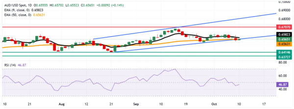 The AUD/USD pair is trading near 0.6570, showing signs of rebounding toward the ascending channel, indicating a revival of bullish bias. Technical indicators provide mixed signals: the 14-day Relative Strength Index (RSI) remains below 50, suggesting medium-term bearish pressure, while support and resistance levels define potential price action.