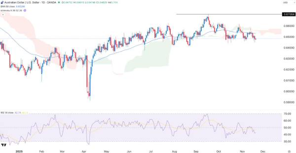 Additional indicators reinforce the bearish tone. The AUD/USD has slipped beneath the Ichimoku cloud, showing that overall trend momentum has shifted toward sellers. At the same time, the Relative Strength Index (RSI) has dipped below the crucial 50 level, signalling weakening buying pressure and a possible continuation of downside momentum.