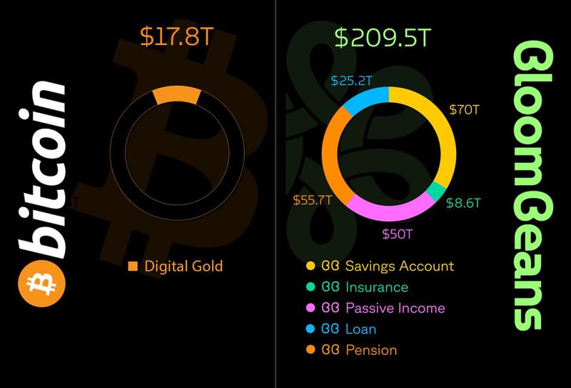 Compared to Bitcoin’s $17 trillion digital gold market, BloomBeans’ total addressable market is estimated at $209.5 trillion, spanning key financial sectors: