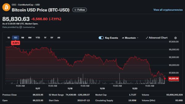 Bitcoin traded as low as $86,854 on Thursday, marking a seven-month low as the flagship cryptocurrency’s 30% decline from October peaks exposes uncomfortable truths about digital assets’ evolution into tech proxies.