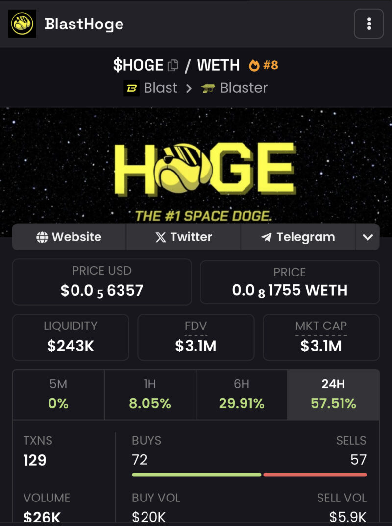 For more detailed token information and live trading updates on BLAST HOGE ($HOGE) visit DEXscreener: https://dexscreener.com/blast/0xbfcd1e44e086244c5d2856ab1e9db4b6530d7b3d