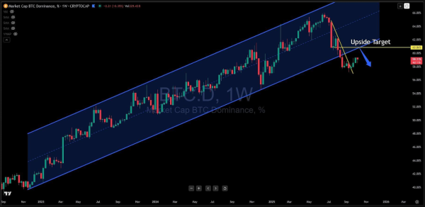 Since bottoming near 40% in late 2022, Bitcoin Dominance has been steadily rising, tracing an ascending channel that has remained remarkably consistent. This channel functions like a staircase, with each step representing periods where Bitcoin slowly regains market share while altcoins remain sidelined. The predictability of this pattern is what makes the current setup so noteworthy.