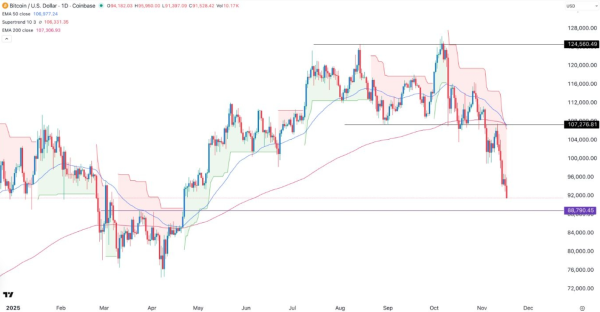 Bitcoin (BTC) has seen a steep decline in recent months, a downtrend that intensified this week. The BTC/USD pair dropped sharply from its October peak of $126,300 to under $91,000, erasing a large portion of gains from earlier in the year.