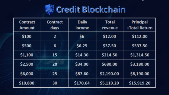 CreditBlockchain has designed a clear earnings mechanism. Users receive stable cryptocurrency income daily based on their chosen computing power contract plan. Earnings can be viewed daily and withdrawn to an external wallet at any time, achieving true liquidity.