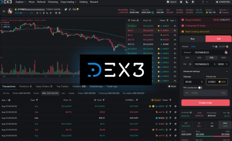 Meme coins are rife with scams and manipulation, but DEX3.AI fights back with AI-powered risk detection. It flags potential scams by analyzing token contracts for red flags (e.g., hidden mint functions) and alerts users to wash trading patterns — artificial volume spikes designed to mislead. This proactive shield helps traders avoid traps, a leap beyond basic DEXs like Raydium or Bullx.