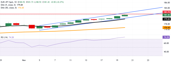 EUR/JPY extended its winning streak for the fourth successive session on Thursday, hitting a fresh all-time high of 181.73. During early European trading hours, the currency pair is currently trading around 181.40, reflecting persistent bullish momentum.