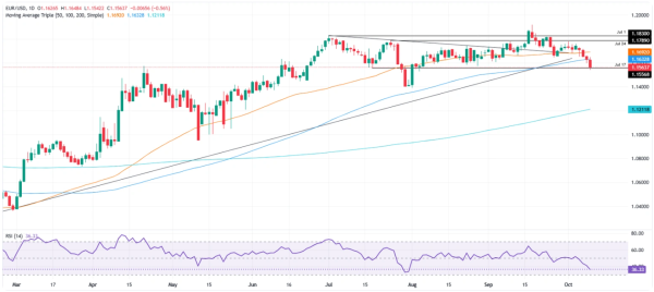 EUR/USD has shifted to a downward-biased trend after breaking below the 20-day Simple Moving Average (SMA) at 1.1644 and the 1.1600 psychological level. The Relative Strength Index (RSI) is heading toward its neutral line, indicating that sellers are gaining momentum.
