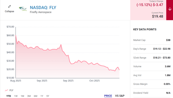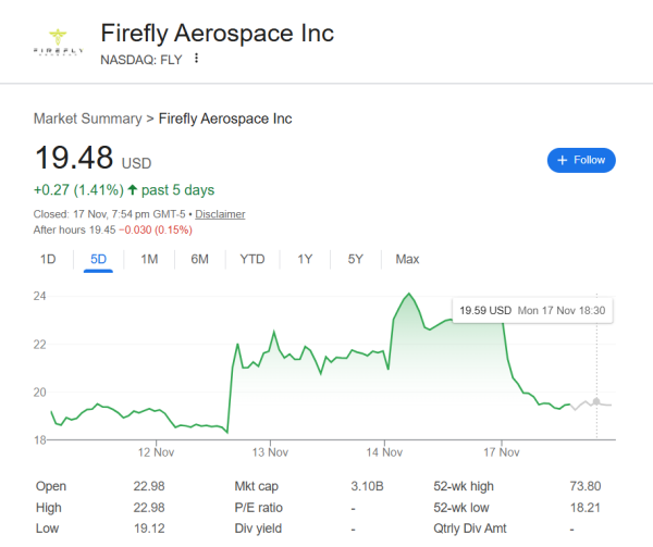 Following the earnings announcement, Firefly stock surged, gaining 17% on Thursday, 7% on Friday, and additional gains in after-hours trading, reaching nearly $23 per share. This rally comes after a challenging period, with the stock down 75% from its high and trading 60% below its IPO price, reflecting the volatility of newly public space companies.