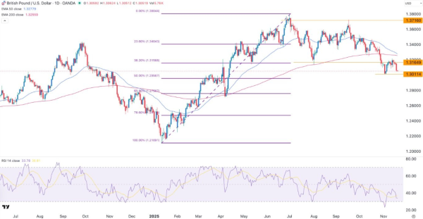 From a technical standpoint, the daily timeframe reveals a market that has entered a pronounced freefall in recent trading sessions. The pair plunged to 1.3050, down from this week’s high of 1.3215, marking a sharp deterioration in near-term momentum.