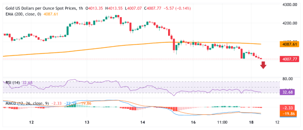 Despite the modest rebound, Gold remains below the $4,000 pivotal level, indicating that upside remains limited. The 200-hour Exponential Moving Average (EMA) has acted as a near-term barrier, as XAU/USD recently failed to reclaim it.