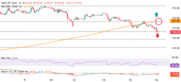 From a technical analysis perspective, the USD/JPY pair fell below the 200-hour Simple Moving Average (SMA) and the 150.70 area, corresponding to the 38.2% Fibonacci retracement of the recent recovery from the October monthly low.
