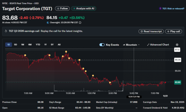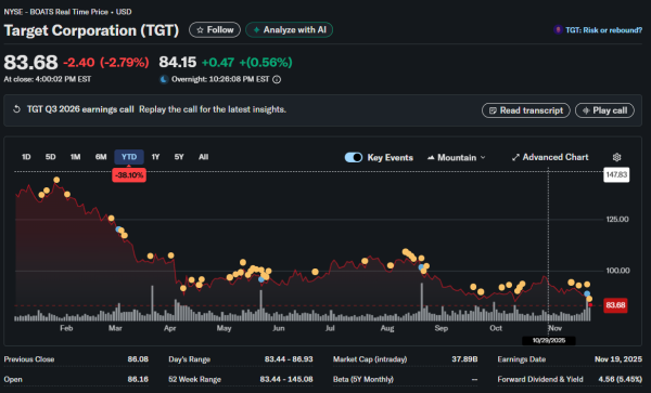 Adjusted earnings per share came in at $1.78, beating expectations of $1.72 but down from $1.85 a year ago. The earnings beat occurred entirely through cost-cutting rather than revenue growth, with Target eliminating 1,800 corporate positions in October, representing 8% of the corporate workforce. Incoming CEO Michael Fiddelke faces the unenviable task of returning Target to growth while operating a leaner organization.