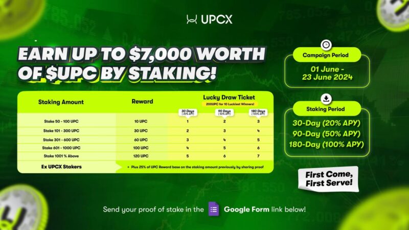 UPCX has launched a brand new staking campaign, allowing users to enjoy substantial rewards during the staking process and have a chance to share $7,000 worth of UPC rewards. This campaign will run until June 23rd.