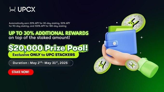 UPCX is excited to announce the official launch of its latest staking campaign, providing participants with exclusive rewards of up to 7,500 UPC (worth $20,000). The campaign will run from May 2, 2025, to May 30, 2025, aiming to reward loyal community members while further strengthening the UPCX ecosystem and its long-term development vision.