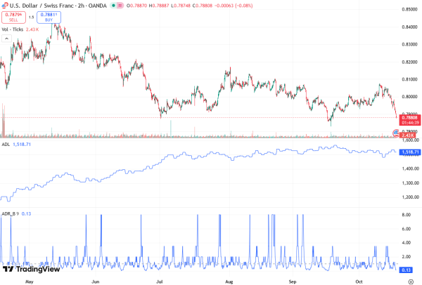 Zusammenfassend ist das USD/CHF-Paar auf ein Zwei-Wochen-Tief gefallen, wobei die Bären die 0,7900-Marke ins Visier nehmen, angesichts des breiten Verkaufsdrucks auf den USD. Wichtige Treiber sind Fed-Zinssenkungserwartungen, der anhaltende US-Regierungsausfall, US-China-Handelsspannungen und verstärktes geopolitisches Risiko, die alle den CHF als sicheren Hafen stärken.