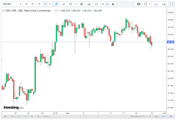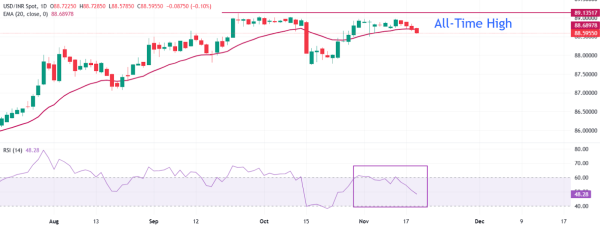 From a technical standpoint, the USD/INR pair continues its correction, trading near 88.60. The pair is approaching the 20-day Exponential Moving Average (EMA) around 88.70, signaling a key support zone for short-term traders.