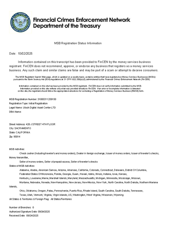 With the MSB registration secured, Utoch Digital Asset Center now operates under advanced compliance protocols, including strict Anti-Money Laundering (AML) and Counter-Terrorist Financing (CFT) controls, enhanced Know Your Customer (KYC) systems, and continuous transaction monitoring.