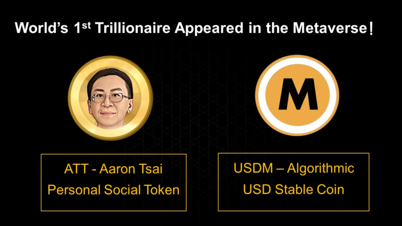 ATT is the personal social token of Aaron Tsai. USDM is an algorithmic USD stablecoin backed by ATT at the ratio of 1:1. Both ATT and USDM are generated on MASFi financial blockchain in MRC-20 standard comparable to Ethereum ERC-20 standard. Two (2) trillion ATT and Two (2) trillion USDM are minted by Aaron Tsai, World’s 1st Trillionaire in the Metaverse.