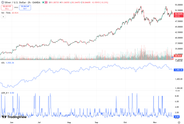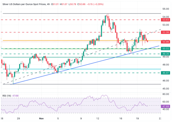 The critical support zone for silver is currently at $50.00, a level reinforced by multiple technical factors. This includes Wednesday’s low, which marks the recent swing low, the 50% Fibonacci retracement of the early November rally, and a rising trendline originating from the late October lows. Together, these elements make $50.00 a key level to watch, as it represents a convergence of significant support indicators in the market.