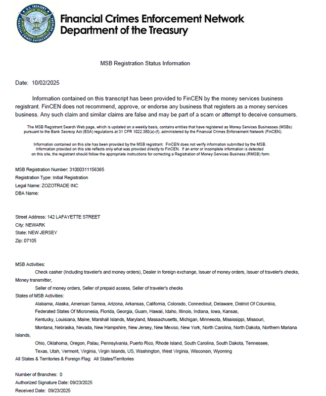 The completion of this registration underscores ZOZOTRADE Exchange’s focus on structured compliance, internal risk management, and operational transparency. Registration details are publicly available through FinCEN’s official MSB registrant search system.